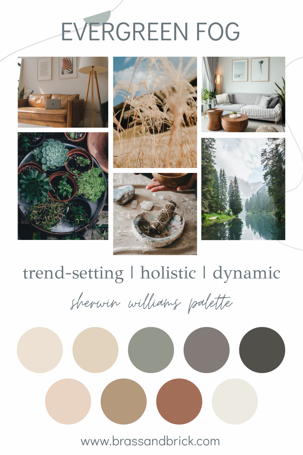 Evergreen Fog Color Palette Brass Brick Interior Design